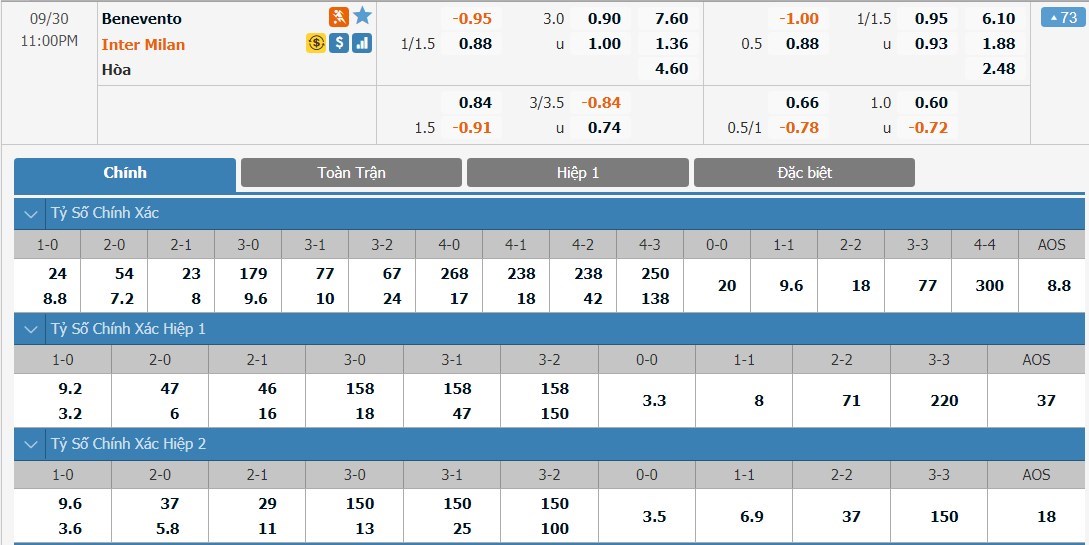 Xem tỷ lệ kèo cá cược bóng đá trực tuyến Benevento vs Inter Milan