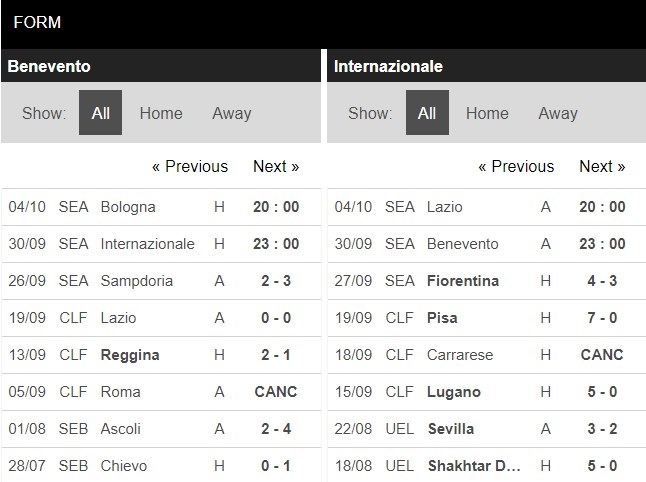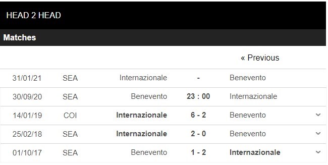 Lần gần nhất hai đội chạm trán với nhau là tại cúp Quốc gia Italia diễn ra vào tháng 1 năm ngoái, khi đó, Benevento đã hứng chịu trận thua đậm 2-6 dưới tay Inter Milan. Ngay trong hiệp 1, Inter đã ghi 3 bàn vào lưới đối thủ. Trong vòng đấu mở màn mùa giải, mặc dù Benevento giành chiến thắng nhưng người ta vẫn thấy được sự thiếu chắc chắn nơi hàng phòng ngự đội bóng này khi họ thủng lưới 2 lần ngay ở hiệp đấu đầu tiên. Inter Milan khả năng cao sẽ nắm lợi thế dẫn bàn khi bước vào giờ nghỉ.