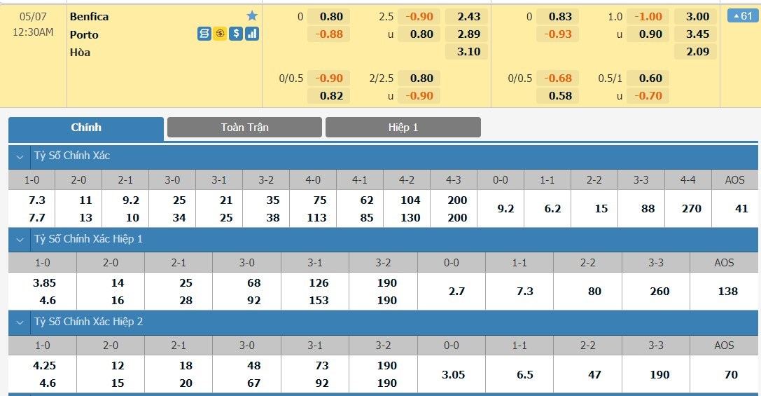 Tỷ lệ kèo cá cược bóng đá trực tuyến trận Benfica vs FC Porto