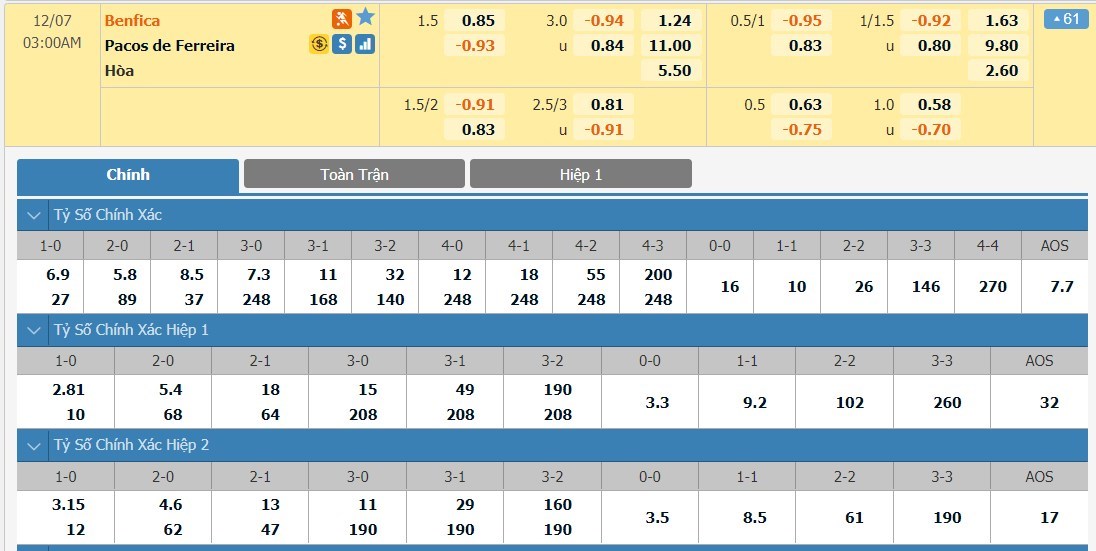 Tỷ lệ kèo cá cược bóng đá trận Benfica vs Ferreira