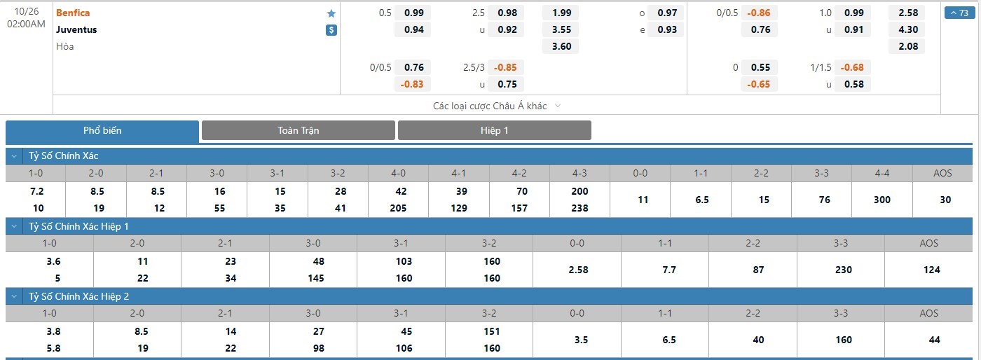 Xem tỷ lệ kèo cá cược bóng đá trực tuyến Benfica vs Juventus