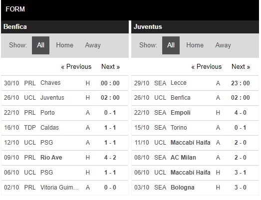Thống kê phong độ Benfica vs Juventus