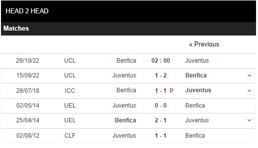 Thống kê đối đầu Benfica vs Juventus