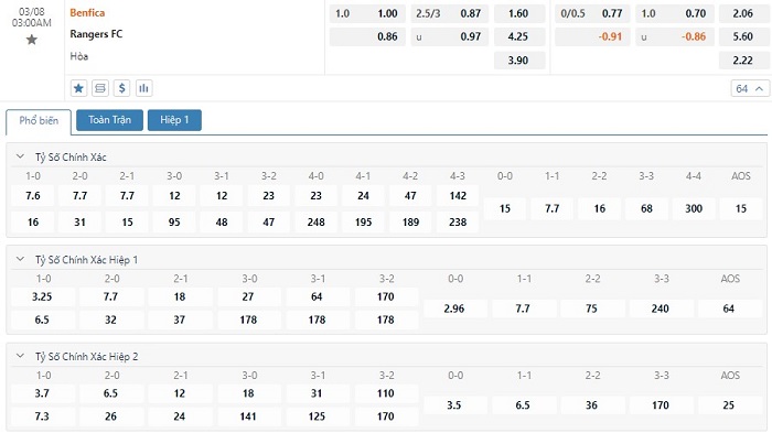 Tỷ lệ kèo cá cược bóng đá trực tuyến trận Benfica vs Rangers FC