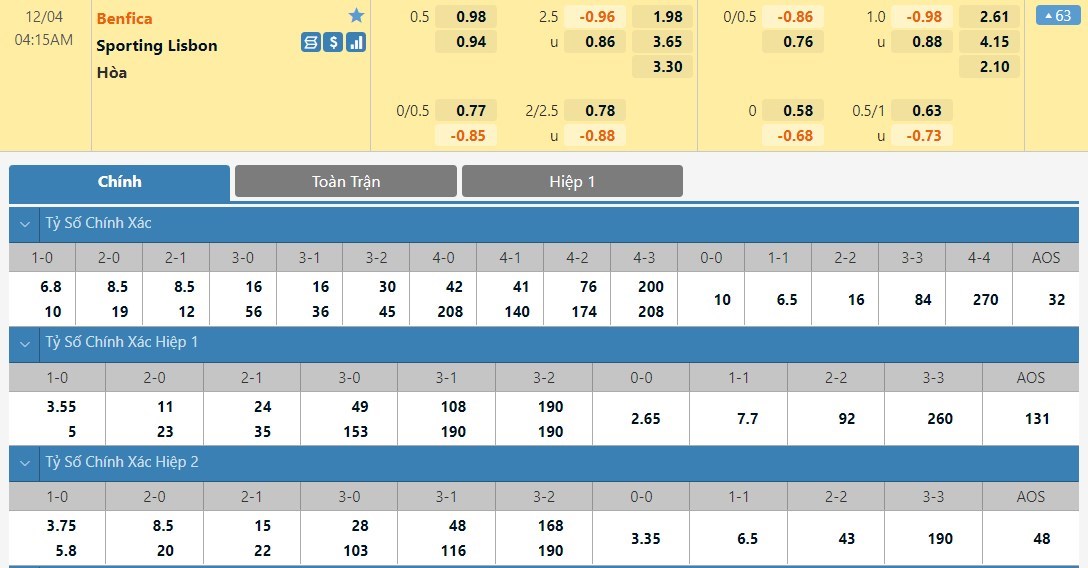 Tỷ lệ kèo cá cược bóng đá trận Benfica vs Sporting Lisbon
