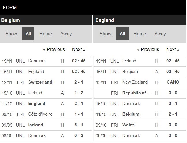 Thống kê phong độ Bỉ vs Anh