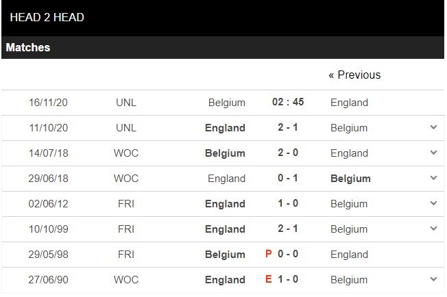 Thống kê đối đầu Bỉ vs Anh
