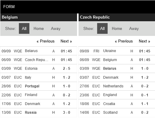 Hiện tại, Bỉ đang dẫn đầu bảng E với 10 điểm sau 4 lượt trận. Họ đánh bại Wales, Belarus, Estonia và chỉ bị đối thủ khó chịu là Séc cầm hòa. Tuy nhiên, Bỉ hoàn toàn có thể giải quyết sớm bảng đấu của mình nếu như giành chiến thắng trước Séc ở màn đối đầu sắp tới.