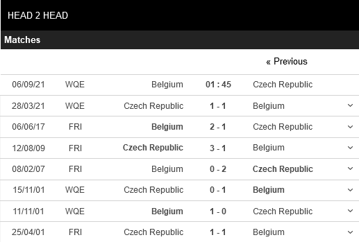 Thống kê đối đầu Bỉ vs Cộng hòa Séc
