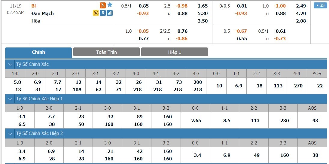 Tỷ lệ kèo cá cược bóng đá trực tuyến trận Bỉ vs Đan Mạch