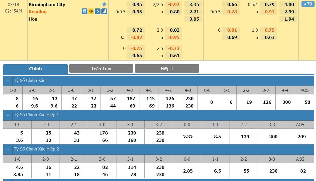Tỷ lệ kèo cá cược bóng đá trận Birmingham City vs Reading