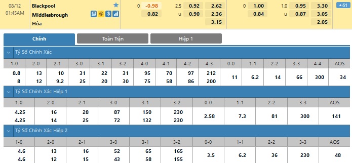 Xem tỉ lệ kèo cá cược bóng đá trực tuyến Blackpool vs Middlesbrough