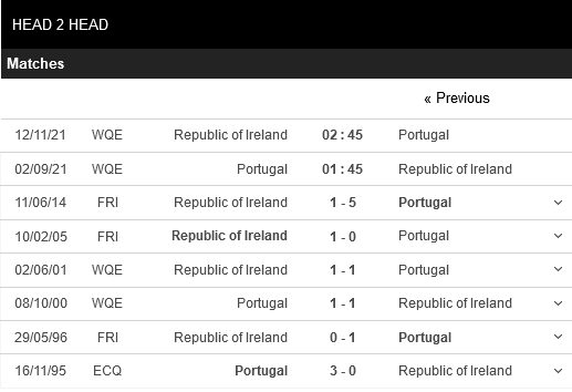 Thống kê đối đầu Bồ Đào Nha vs Ireland