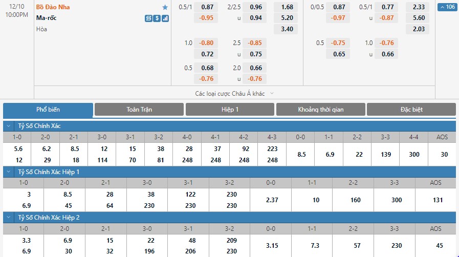 Xem tỷ lệ kèo cá cược bóng đá trực tuyến Bồ Đào Nha vs Ma Rốc