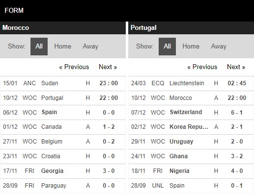 Thống kê phong độ Bồ Đào Nha vs Ma Rốc