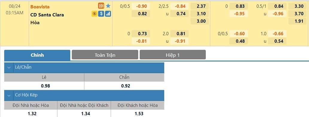 Tỷ lệ kèo cá cược bóng đá trận Boavista vs Santa Clara