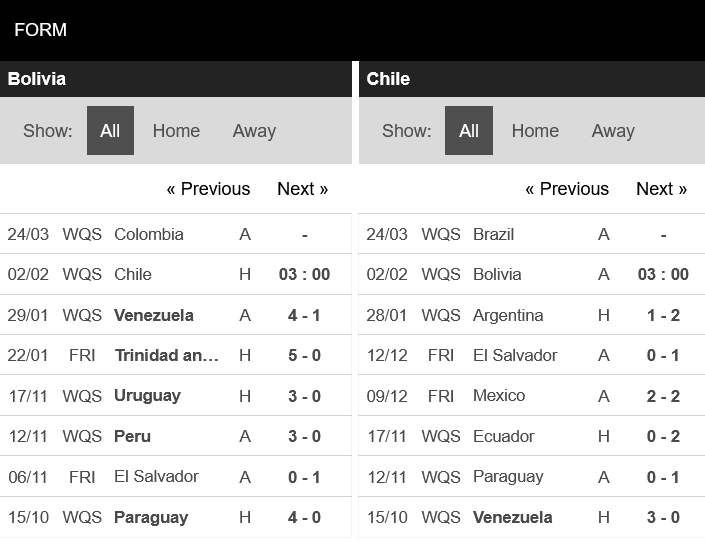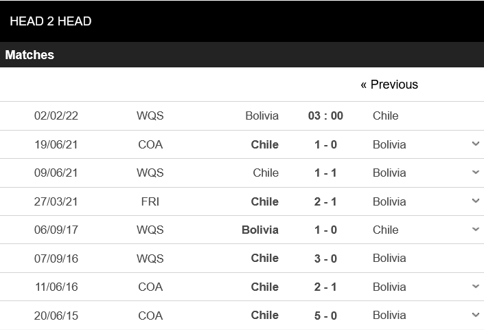 Ở 10 trận vòng loại World Cup gần nhất, Bolivia chỉ thắng 2 trận. Tuy nhiên, Chile thậm chí chỉ thắng 1 trong 10 trận gần nhất ở vòng loại World Cup.