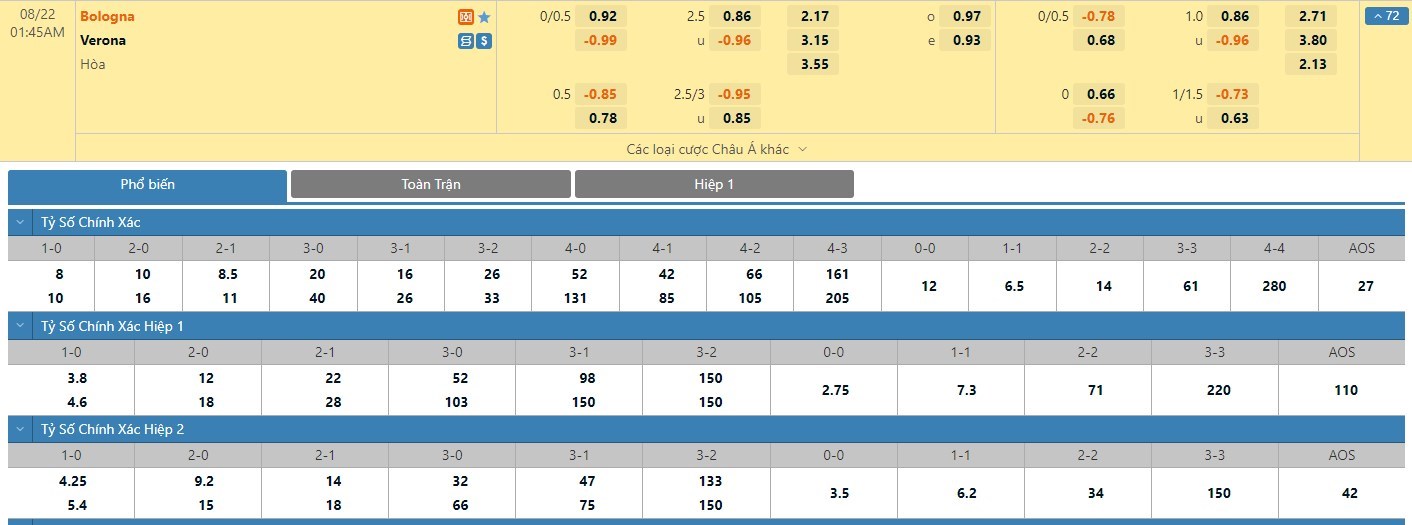 Tỷ lệ kèo cá cược bóng đá trận Bologna vs Hellas Verona