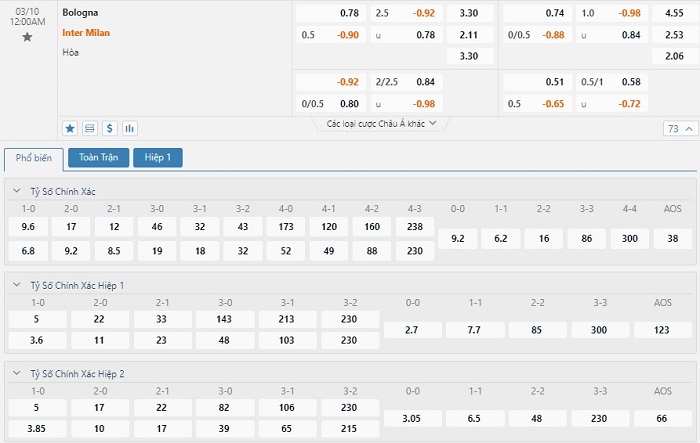 Tỷ lệ kèo cá cược bóng đá trực tuyến trận Bologna vs Inter Milan