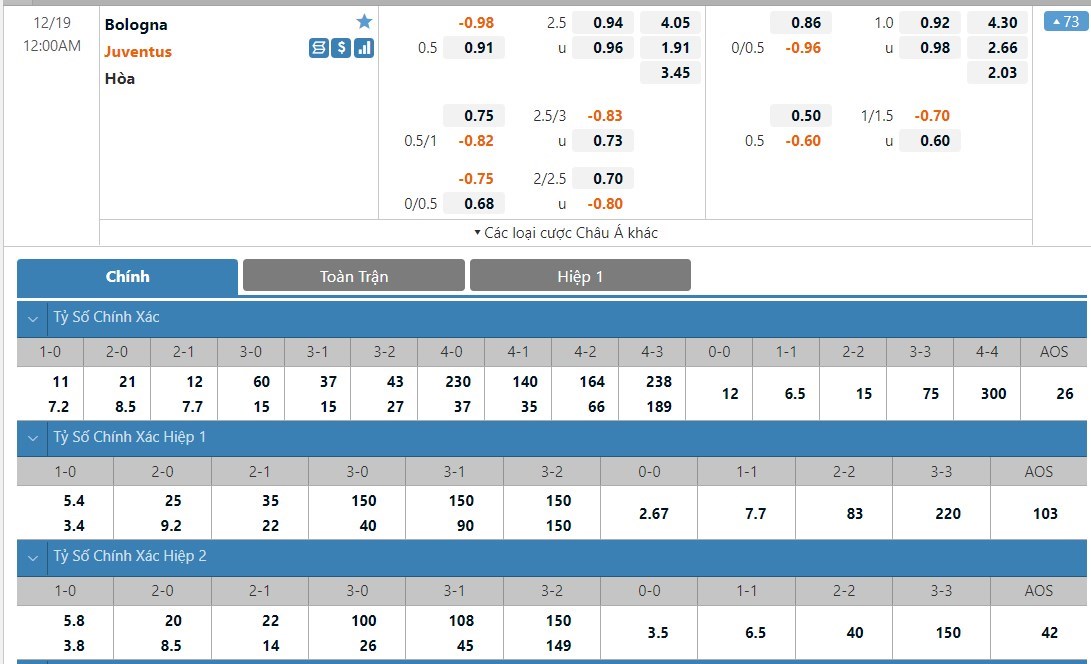 Tỷ lệ kèo cá cược bóng đá trận Bologna vs Juventus