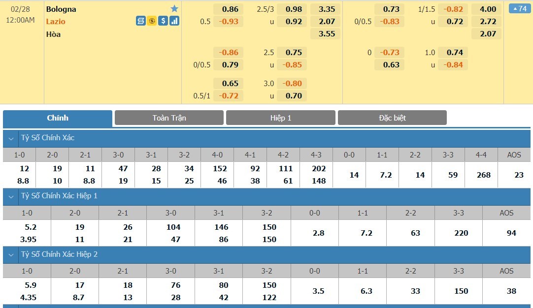 Tỷ lệ kèo cá cược bóng đá trận Bologna vs Lazio