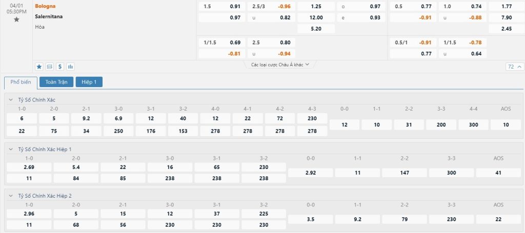 Tỷ lệ kèo cá cược bóng đá trực tuyến trận Bologna vs Salernitana