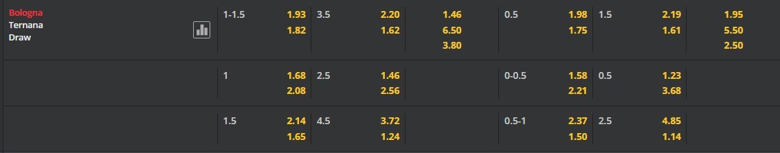 Tỷ lệ kèo cá cược bóng đá trực tuyến trận Bologna vs Ternana
