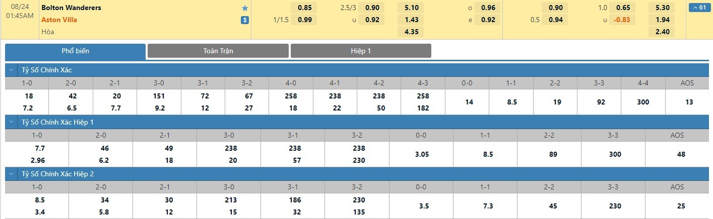 Tỷ lệ kèo cá cược bóng đá trực tuyến trận Bolton vs Aston Villa