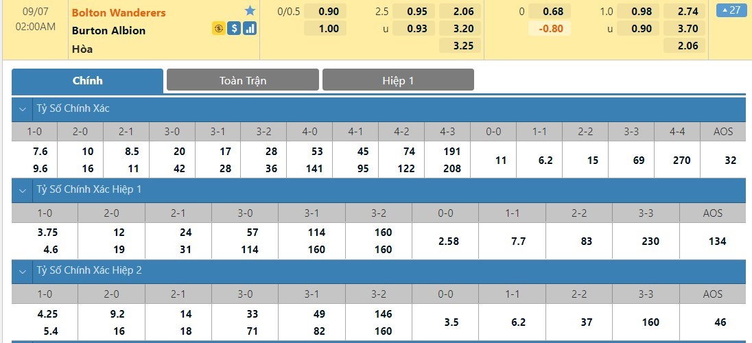 Tỷ lệ kèo cá cược bóng đá trận Bolton Wanderers vs Burton Albion