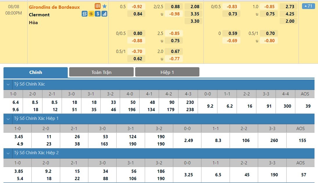 Tỷ lệ kèo cá cược bóng đá trực tuyến trận Bordeaux vs Clermont Foot
