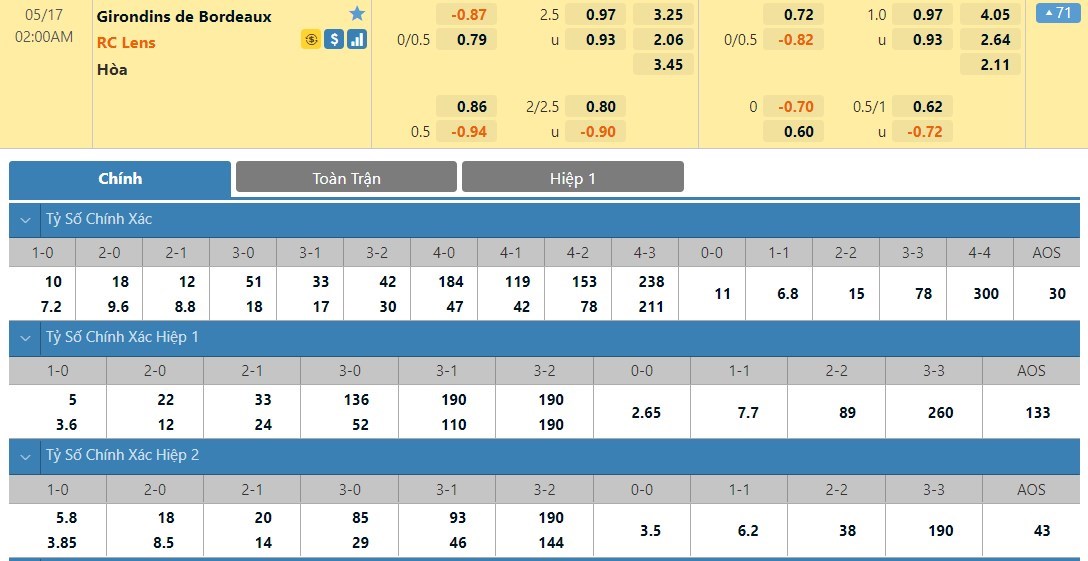 Tỷ lệ kèo cá cược bóng đá trận Bordeaux vs Lens