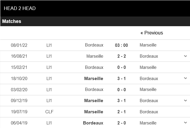 Thống kê đối đầu Bordeaux vs Marseille