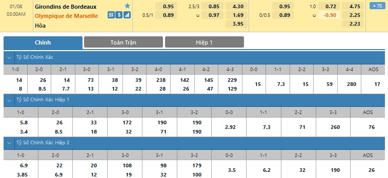 Xem tỷ lệ kèo cá cược bóng đá trực tuyến Bordeaux vs Marseille