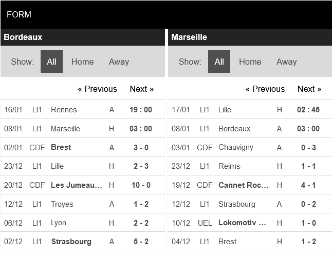 Thống kê phong độ Bordeaux vs Marseille