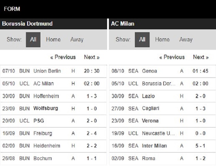 Thống kê phong độ Borussia Dortmund vs AC Milan