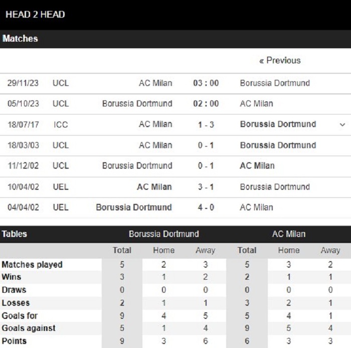 Thống kê đối đầu Borussia Dortmund vs AC Milan