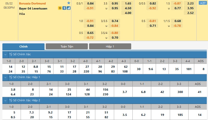 Xem tỉ lệ kèo cá cược bóng đá trực tuyến Borussia Dortmund vs Bayer Leverkusen