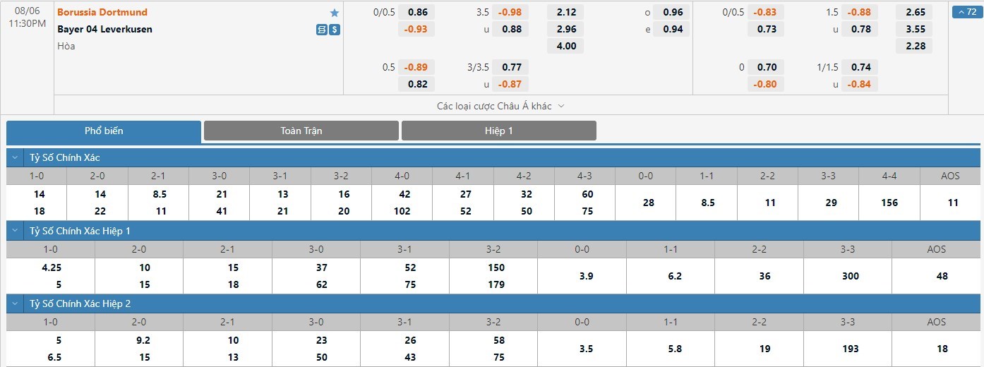 Tỷ lệ kèo cá cược bóng đá trận Borussia Dortmund vs Bayer Leverkusen