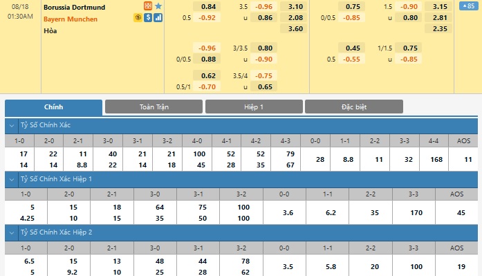 Xem tỉ lệ kèo cá cược bóng đá trực tuyến Borussia Dortmund vs Bayern Munich