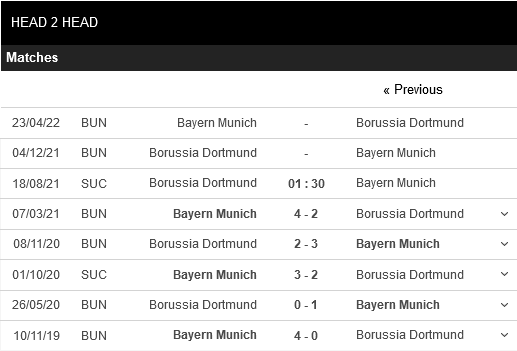 Thống kê đối đầu Borussia Dortmund vs Bayern Munich