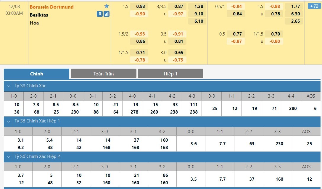 Tỷ lệ kèo cá cược bóng đá trực tuyến trận Borussia Dortmund vs Besiktas