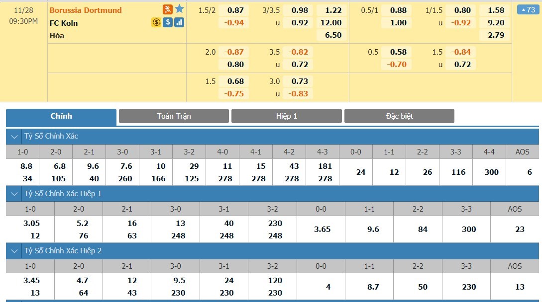 Tỷ lệ kèo cá cược bóng đá trận Borussia Dortmund vs FC Köln