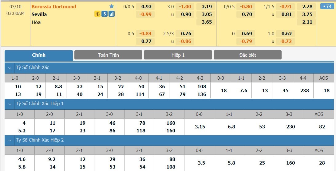 Xem tỷ lệ kèo cá cược bóng đá trực tuyến Borussia Dortmund vs Sevilla
