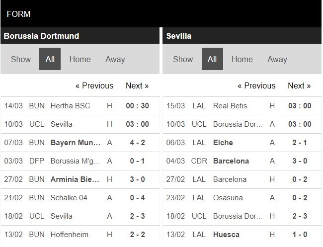 Thành tích chung của đại diện thành phố cảng cũng là rất tệ. Họ thua 4 trong 5 trận gần nhất trên mọi đấu trường. Ở La Liga, Borussia Dortmund có vị trí thứ 4 trên BXH cùng với 48 điểm có được. Tại UEFA Champions League, Sevilla đã gặp khó khăn khi nhận thất bại 2-3 trên sân khách ở lượt đi vòng 1/8 trước đối thủ Borussia Dortmund. Trước mắt họ sẽ là 1 cuộc tái đấu sinh tử tại Signal Iduna Park. Áp lực dành cho đội khách là không nhỏ bởi kết quả từ trận lượt đi. Sevilla thực sự không ở vào trạng thái phong độ tốt khi đã thua liên tiếp và gần nhất là trận thua khó lý giải với tỷ số 1-2 dưới tay Elche.