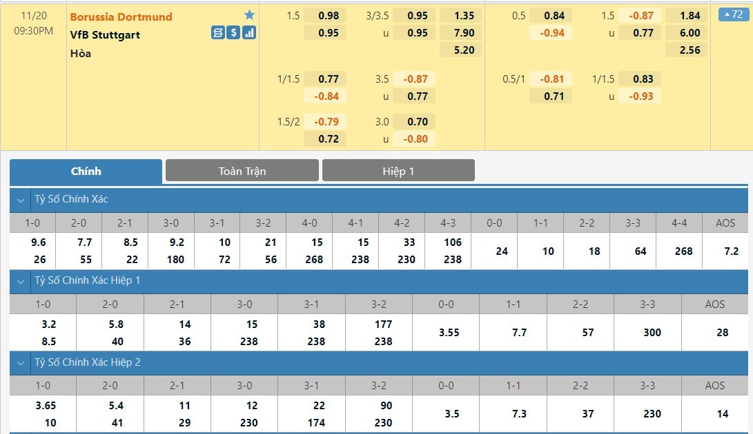 Tỷ lệ kèo cá cược bóng đá trực tuyến trận Borussia Dortmund vs Stuttgart