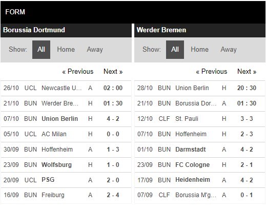 Thống kê phong độ Borussia Dortmund vs Werder Bremen