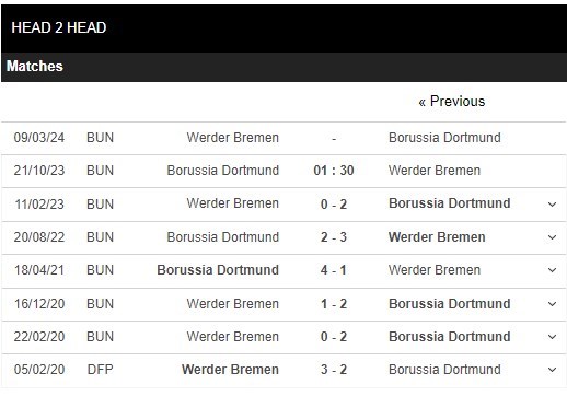 Thống kê đối đầu Borussia Dortmund vs Werder Bremen