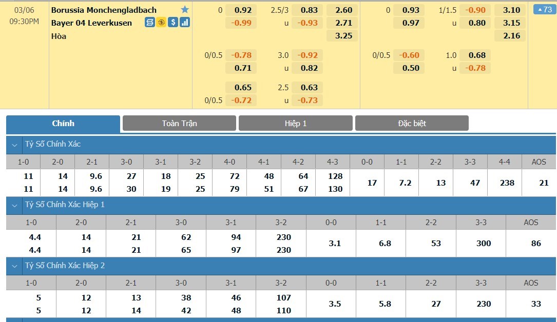 Tỷ lệ kèo cá cược bóng đá trận Borussia M.Gladbach vs Bayer Leverkusen