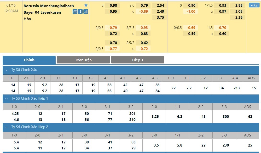 Tỷ lệ kèo cá cược bóng đá trận Borussia M.Gladbach vs Bayer Leverkusen