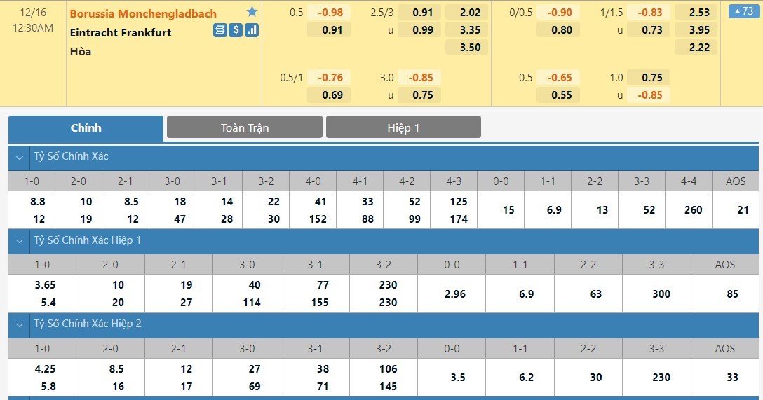 Tỷ lệ kèo cá cược bóng đá trực tuyến trận Borussia M.Gladbach vs Eintracht Frankfurt